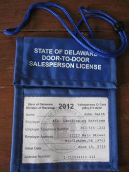 A picture of the salesperson ID card and required license holder is shown above. Delaware residents are encouraged to call their local police departments if they see anyone in their neighborhoods conducting door-to-door sales without wearing the registered salesperson ID card, or if they are visited by someone who isn’t wearing a registered salesperson ID card.